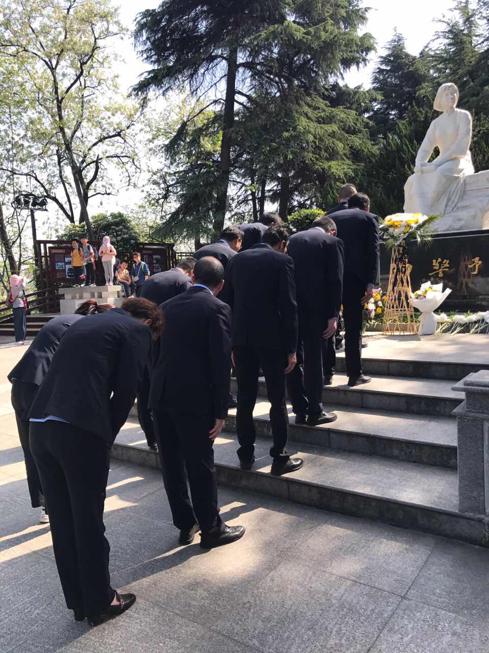 早上9:00到達(dá)向警予烈士陵園,整座陵園依山傍水,綠樹環(huán)繞,莊嚴(yán)肅穆。全體黨員干部依次上前鞠躬、敬獻(xiàn)花籃,靜靜瞻仰烈士紀(jì)念碑。